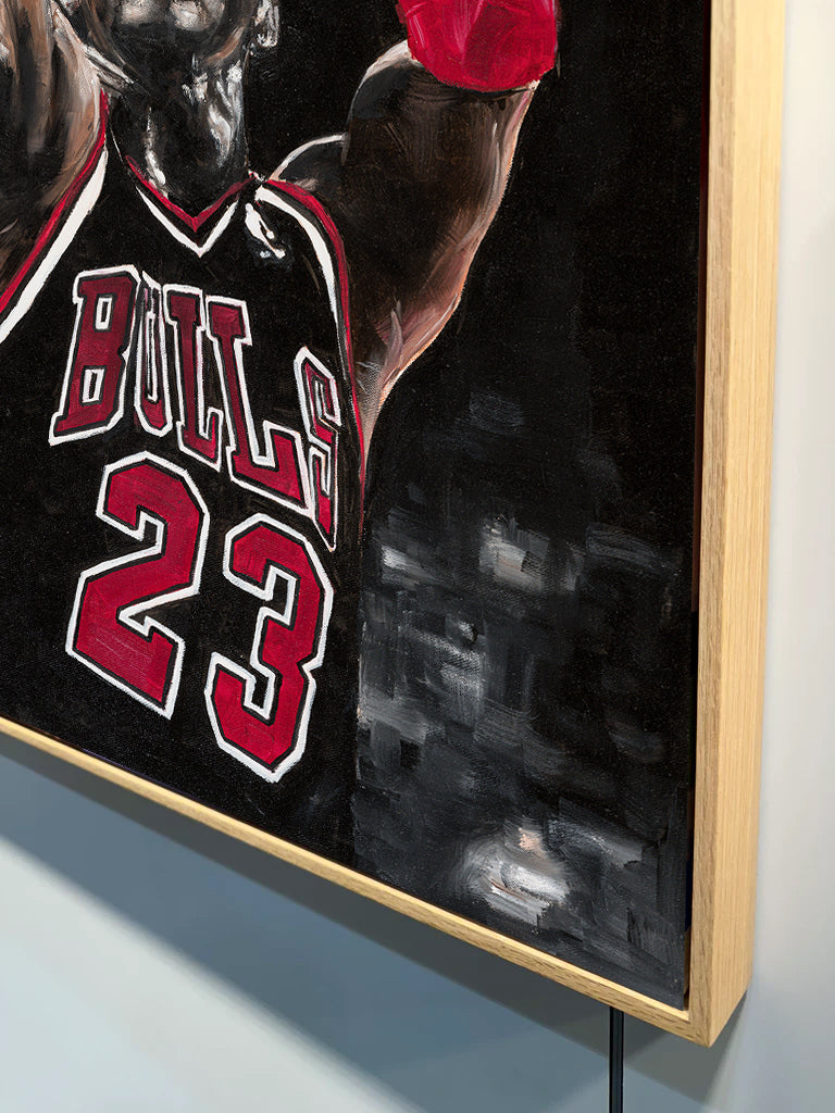 Michael Jordan No.1, is part of an ongoing series of this basketball champion. A hero of mine as a young age, I would watch 'Michael Jordan's Playground' on VHS before every game and had many of his basketball cards! Loved painting this original with expressive oil strokes and dark blurred background to focus on Jordan's iconic shot.